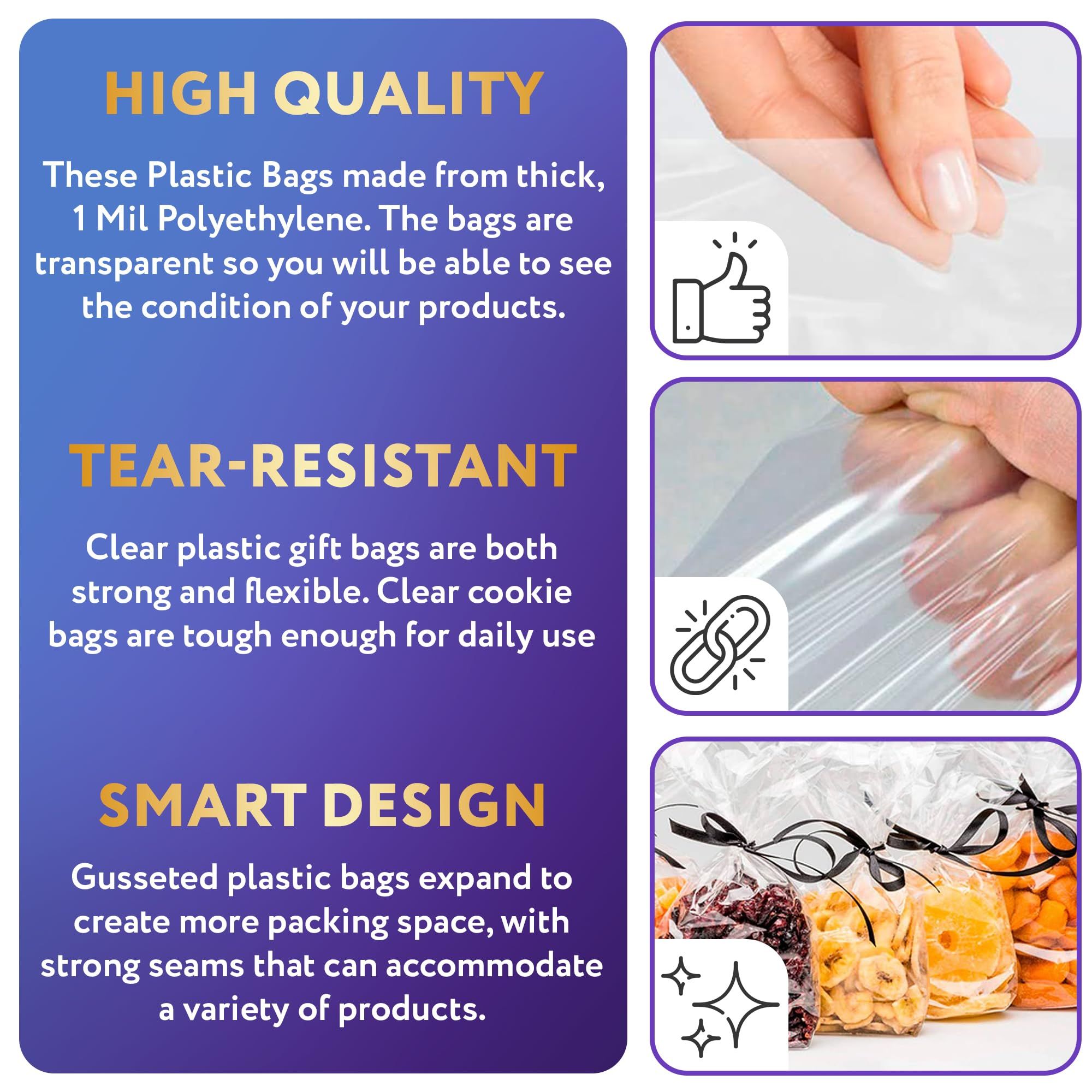 3.Well-Made and Tear-Resistant. The gusseted sides of the clear plastic gift bags open out to provide more space. These clear plastic bags have durable sealed seams and can hold a lot of food without tearing.