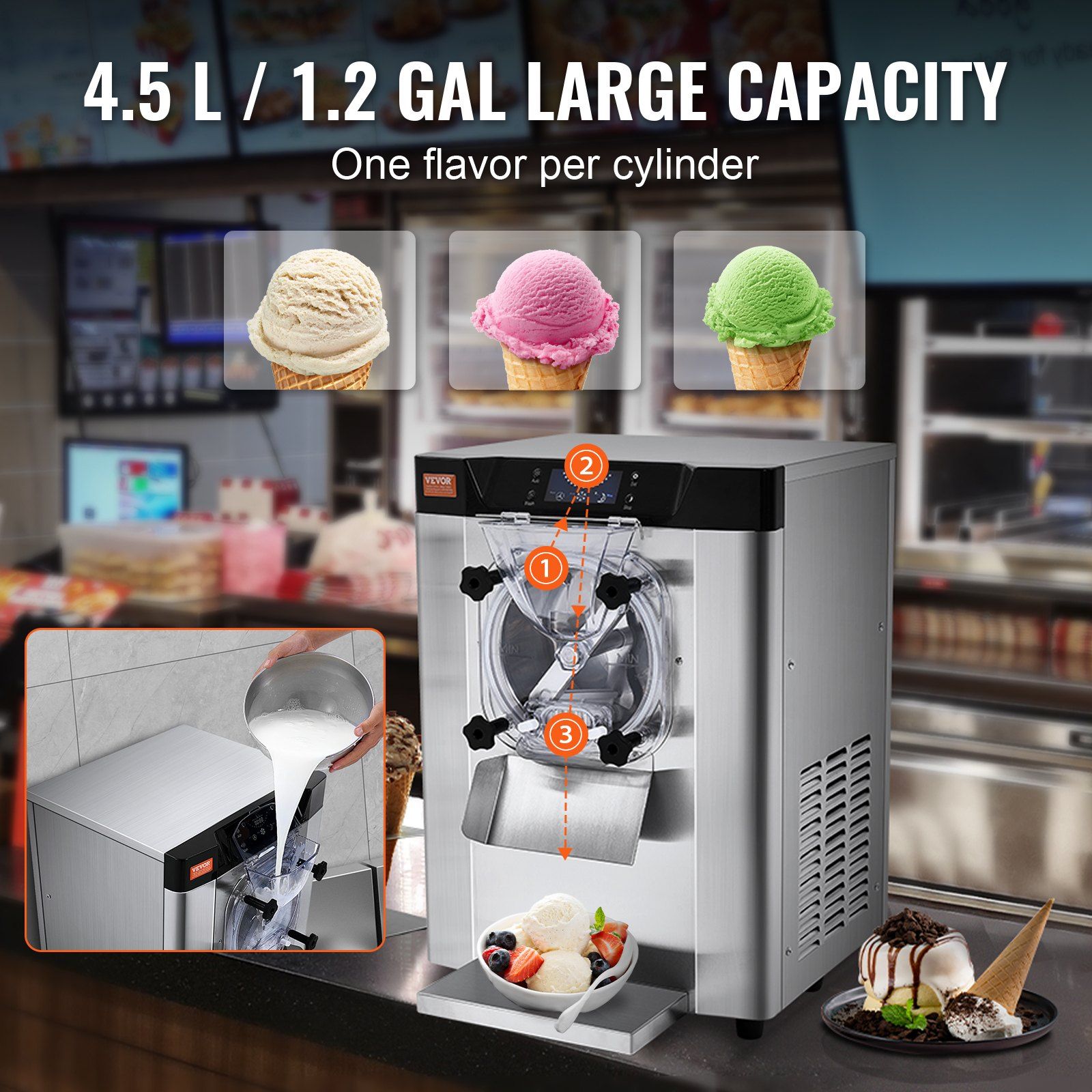 This commercial desktop ice cream maker produces ice cream in just 20 minutes. With a powerful compressor that operates quietly at less than 66 dB. The 4.5L/1.2gal capacity can produce 12L/3.2gal per hour, perfect for mixing smooth hard ice cream.